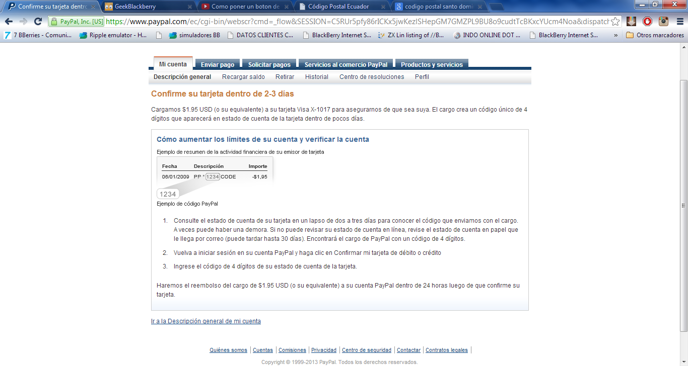 Después de la activación de nuestra cuenta en PayPal para terminar con el proceso de verificación de la tarjeta de crédito, en nuestro caso la tarjeta pre-pagada PayCard debemos esperar de 2 a 3 días que nos envíen un código de 4 digitos, en el caso de las tarjetas de crédito hay que consultar el estado de cuenta de su tarjeta para conocer el código que le llegara con el cargo. A veces puede haber una demora. Si no puede revisar su estado de cuenta en línea, revise el estado de cuenta en papel que le llega por correo (puede tardar hasta 30 días). Encontrará el cargo de $1.95 USD PayPal con un código de 4 dígitos.